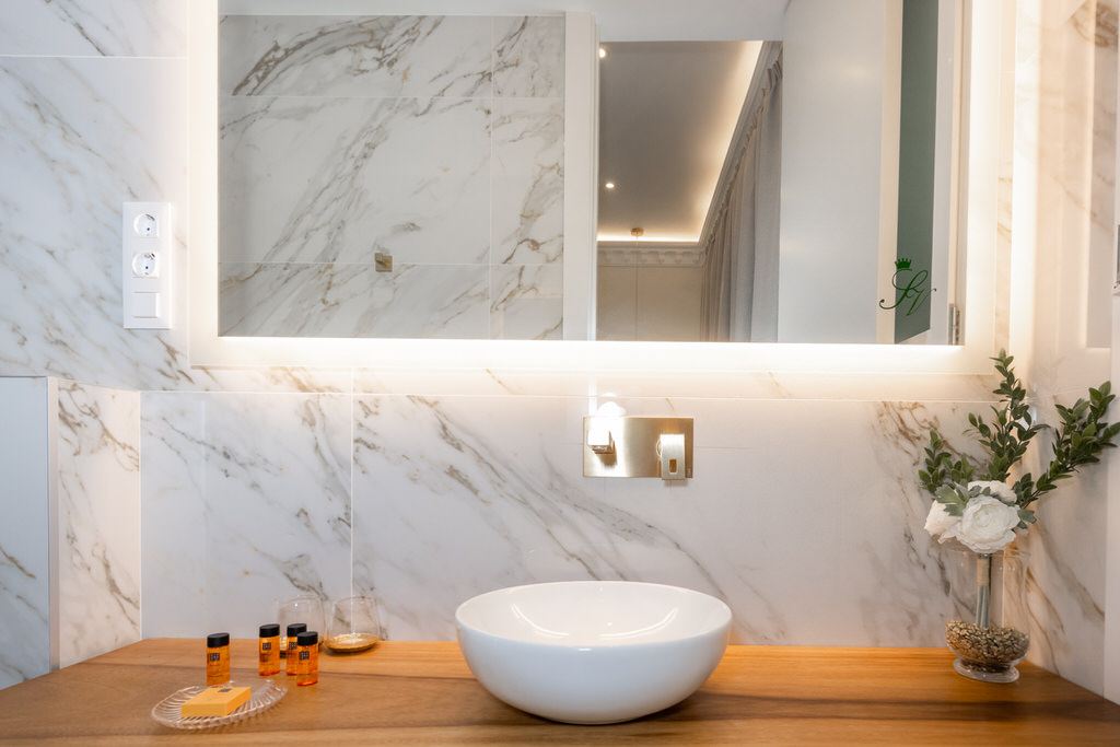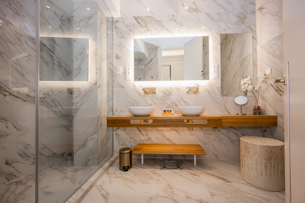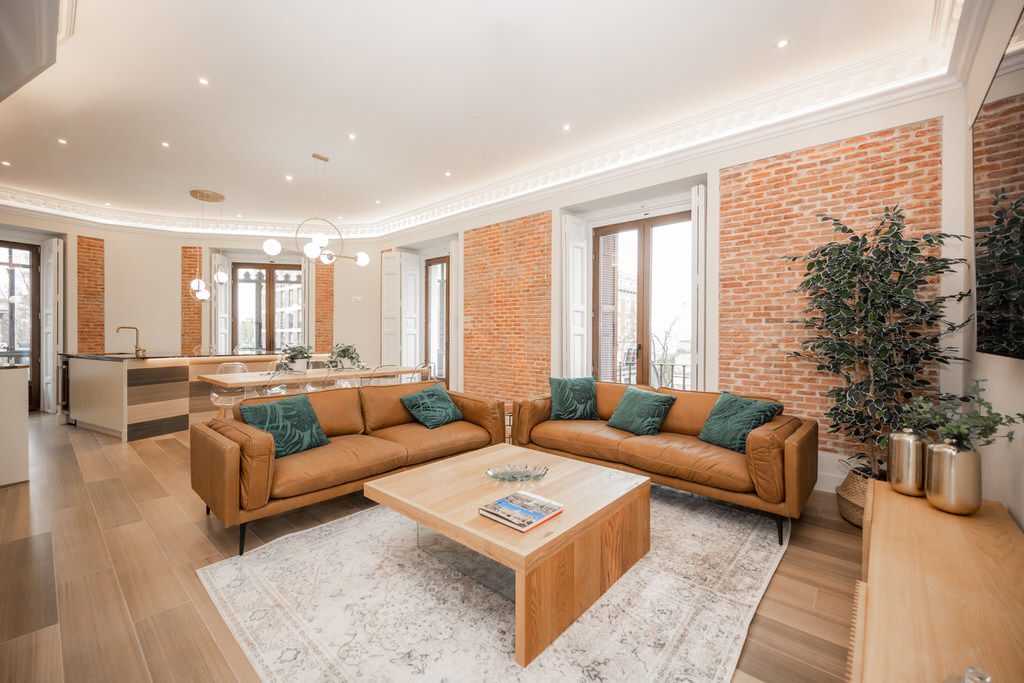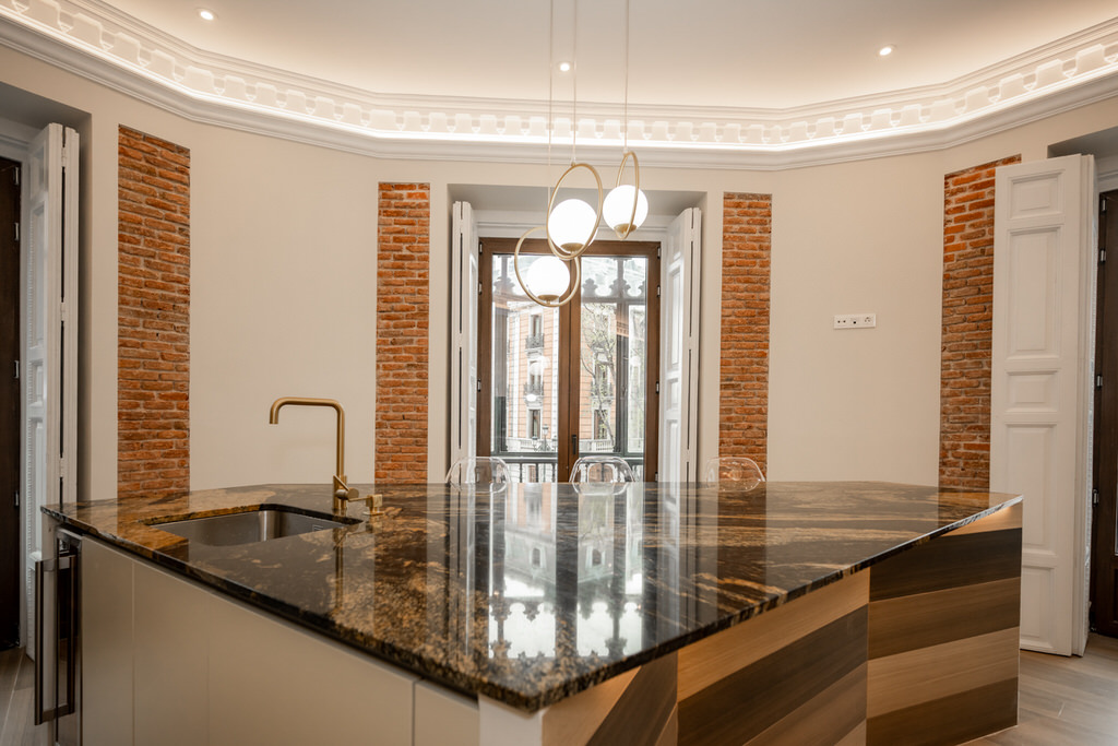 El uso de elementos y materiales clásicos contrasta con la disposición moderna de los espacios.